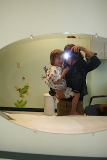 Lucas was sitting quietly on the side of the table, in his little gown with his bare legs hanging over the side. After the doc and I had been talking for about 15 min he said, "quit talkinggggg" with a little smile on his face. The doc then decided to entertain Lucas with a few questions. He asked him to name 3 friends in his class... Ian, Nicholas and Landon. After that he asked about him being a good big brother and what he does to do that. Lucas was still thinking of what he would say and so the doc asked him what he could do to be a BAD big brother. Lucas pondered the question and the said, "Violence." Hmmm, that works.