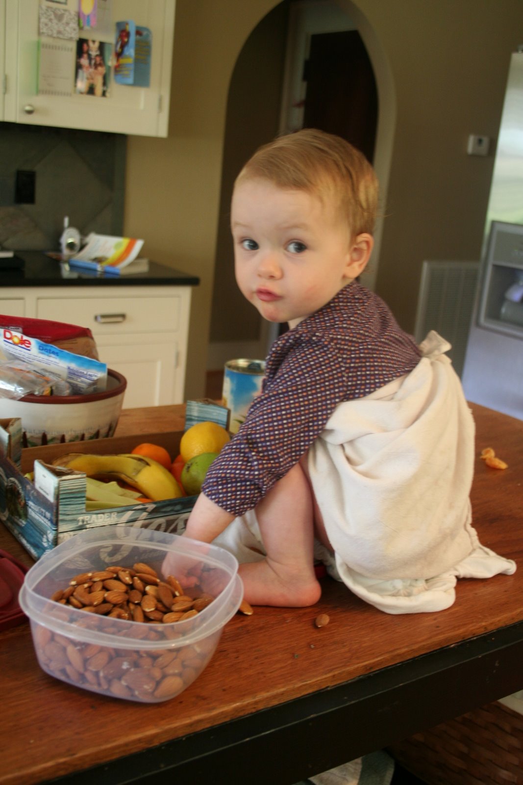 I love to cook good meals for us all, but it's so hard with my 18 month old side kick. She wants to help me, just like Lucas did at her age (and still does, but he IS actually a help now). So the bird spends a lot of time on the island moving nuts and things like that from one container to another...